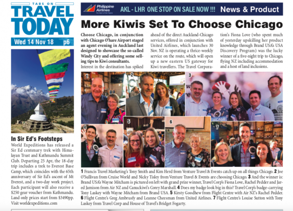 These events took place ahead of the launch of the of the new direct flight to Chicago from Auckland with Air New Zealand in late November 2018. Events were held in Sydney, Melbourne, Auckland, Christchurch and Wellington. We partnered with Air New Zealand and United Airlines on the events. More than 350 agents were in attendance across the events.